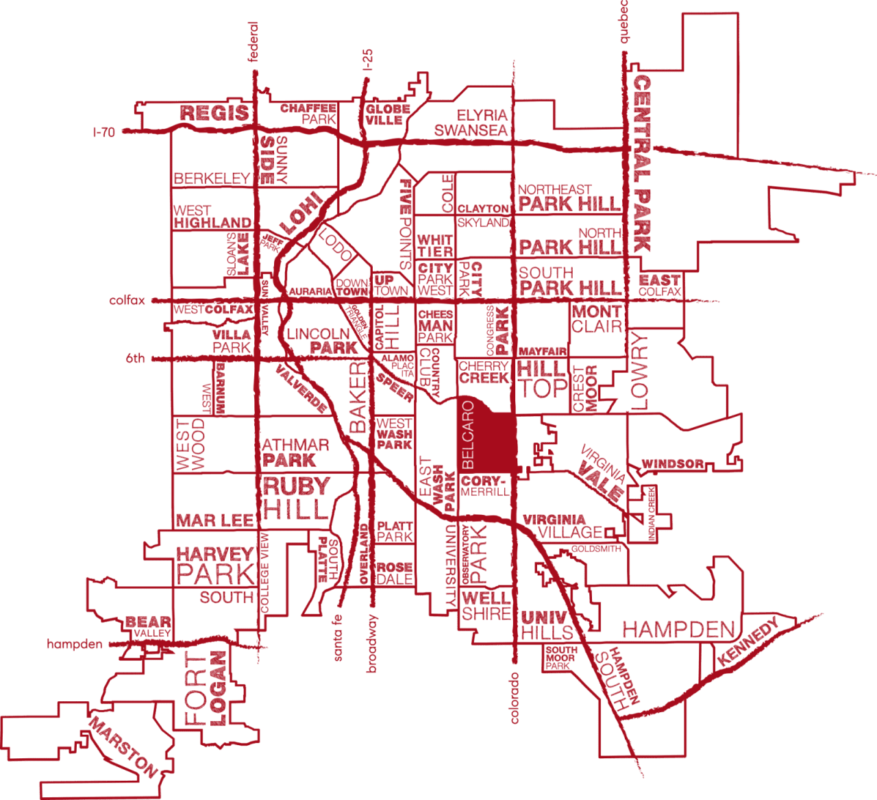 The Belcaro neighborhood is a predominantly quiet residential area characterized by large-ranch style homes, expansive front lawns and beautiful, tree-lined streets. In recent years some older properties have been demolished and replaced with larger luxury homes with a more modern flare. Belcaro is centrally located with the Cherry Creek North shopping district located directly to the north and Downtown Denver just minutes away. A large gated community called the Polo Club occupies the northern section of the neighborhood while Bonnie Brae occupies the southwest corner of the neighborhood. Often the Polo Club and Bonnie Brae are considered distinct and separate neighborhoods.