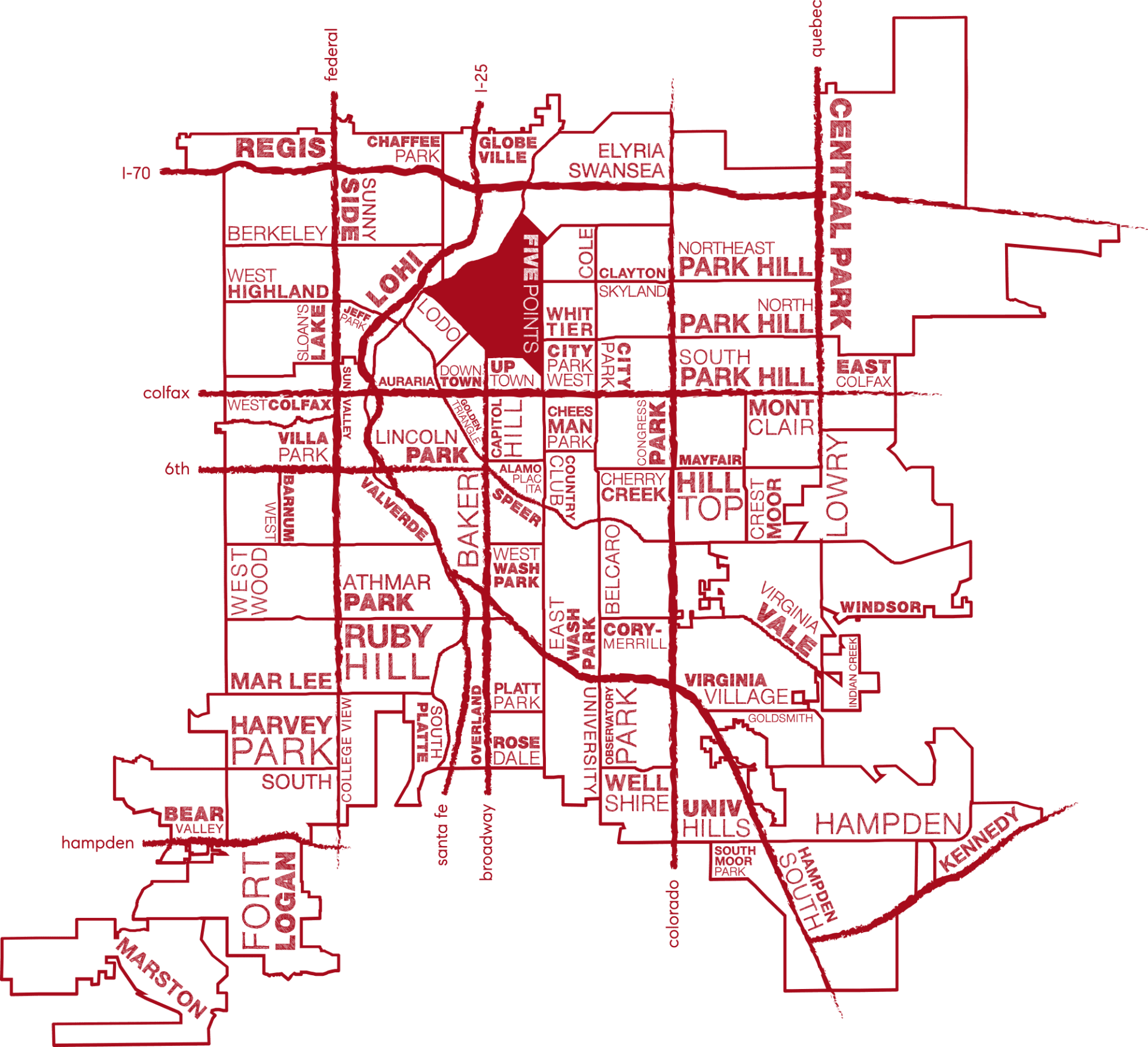 The Five Points neighborhood, named for the five-way intersection of Washington Street, 27th Avenue, Welton Street and 26th Avenue is one of Denver’s oldest neighborhoods. It is located northeast of Downtown Denver where the downtown street grid meets the neighborhood street grid and encompasses the Ballpark, Curtis Park, Arapahoe Square and RiNo sub-neighborhoods.