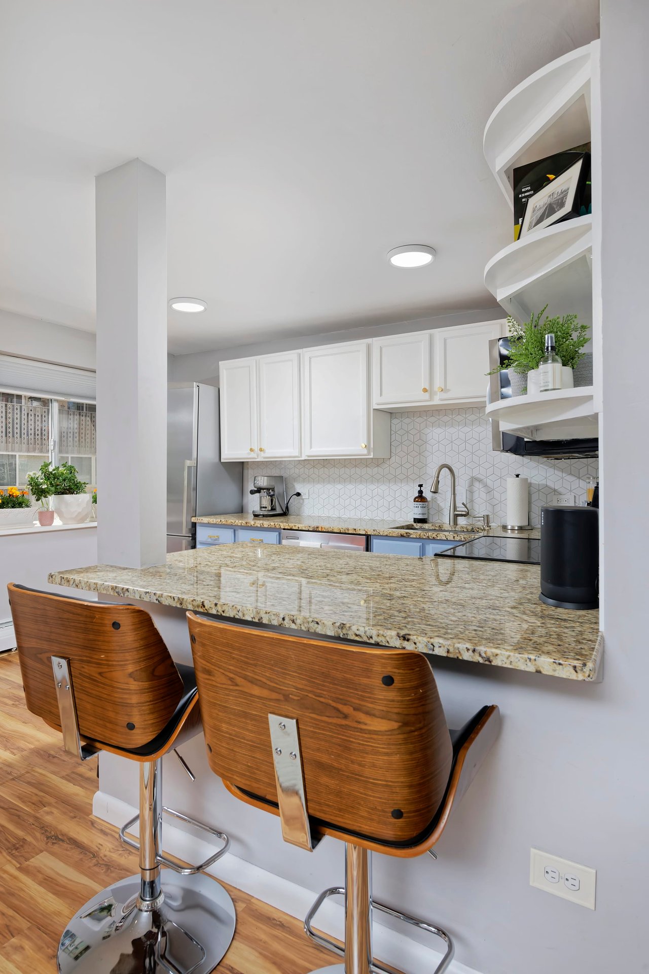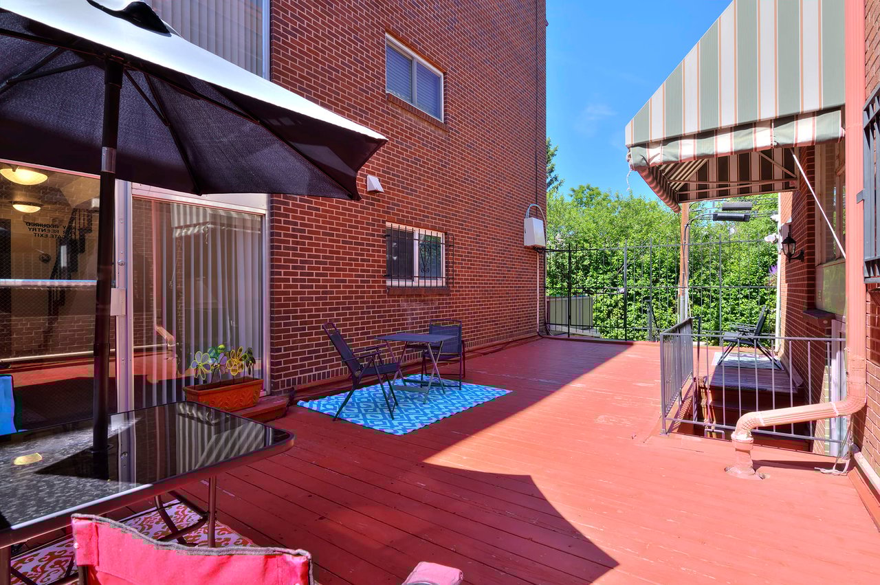 This is a rare opportunity to live ON Cheesman Park! This two-bedroom unit is located on the northeast corner of the park with direct access through a shared patio to the park. The updated unit features an open kitchen with bar seating, slab granite countertops, white and blue shaker-style cabinetry and a contemporary white tile backsplash. There is durable wood-look laminate flooring throughout the main living area and sliding glass doors that open up onto an extensive private balcony that is shaded by mature trees. Both bedrooms in this unit are sizable with plush carpet, custom blackout blinds and substantial closet space. The bathroom has been updated and is complete with white subway wall tile, Carrara marble hexagon floor tile, a contemporary vanity and chrome fixtures. The unit comes with two newer built-in cooling units, a covered and secure reserved parking space and two storage units. The HOA dues cover heat, water/sewer, trash, snow removal, building/grounds maintenance and common area access including two shared patios and a convenient laundry room. This unit is move-in ready with all updates complete and perfect for an owner occupant or investor. Enjoy life on the park with easy access to the Botanic Gardens, Congress Park, Carla Madison Rec Center and area shops/restaurants including Liks Ice Cream just 1 block away!